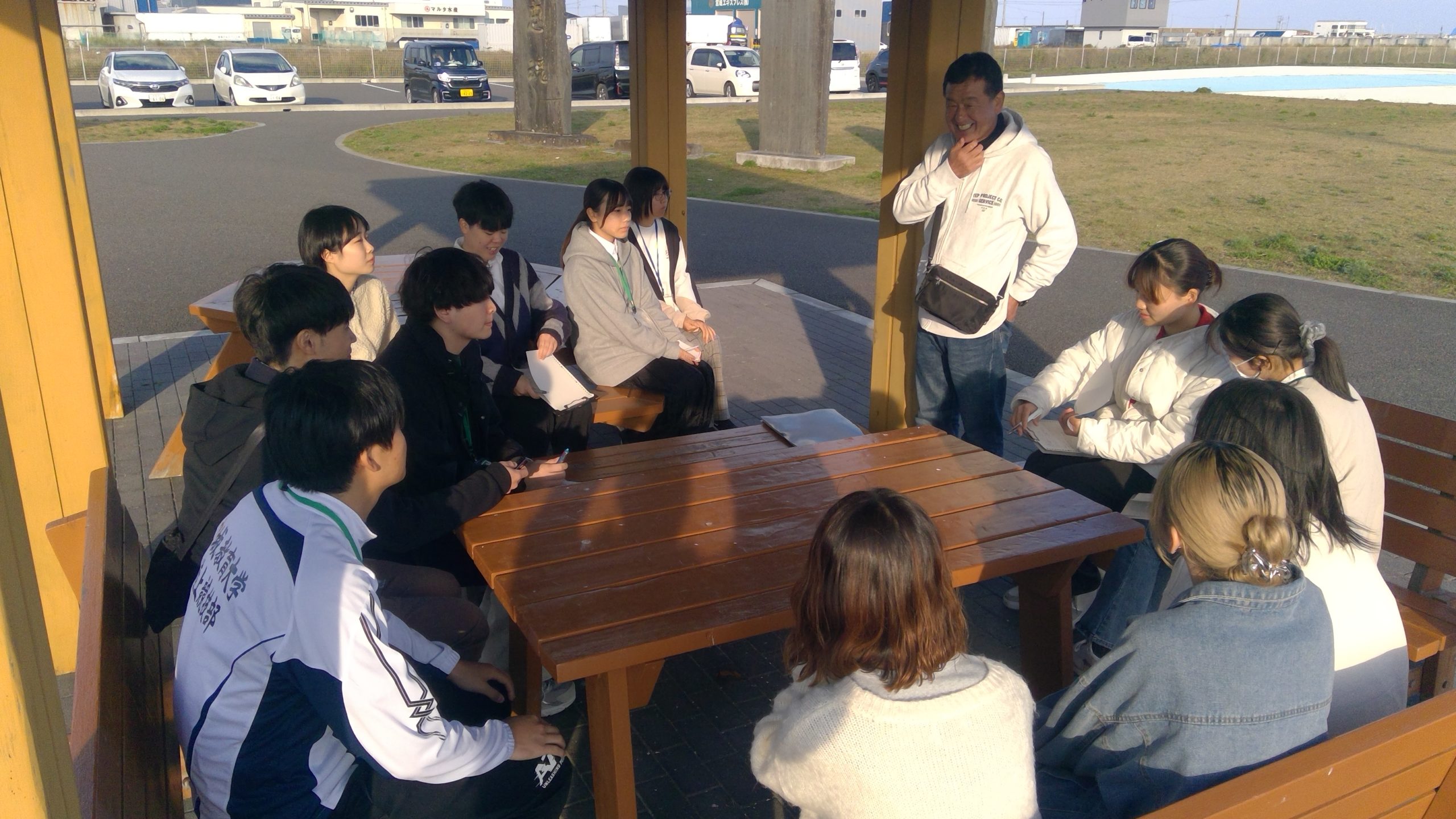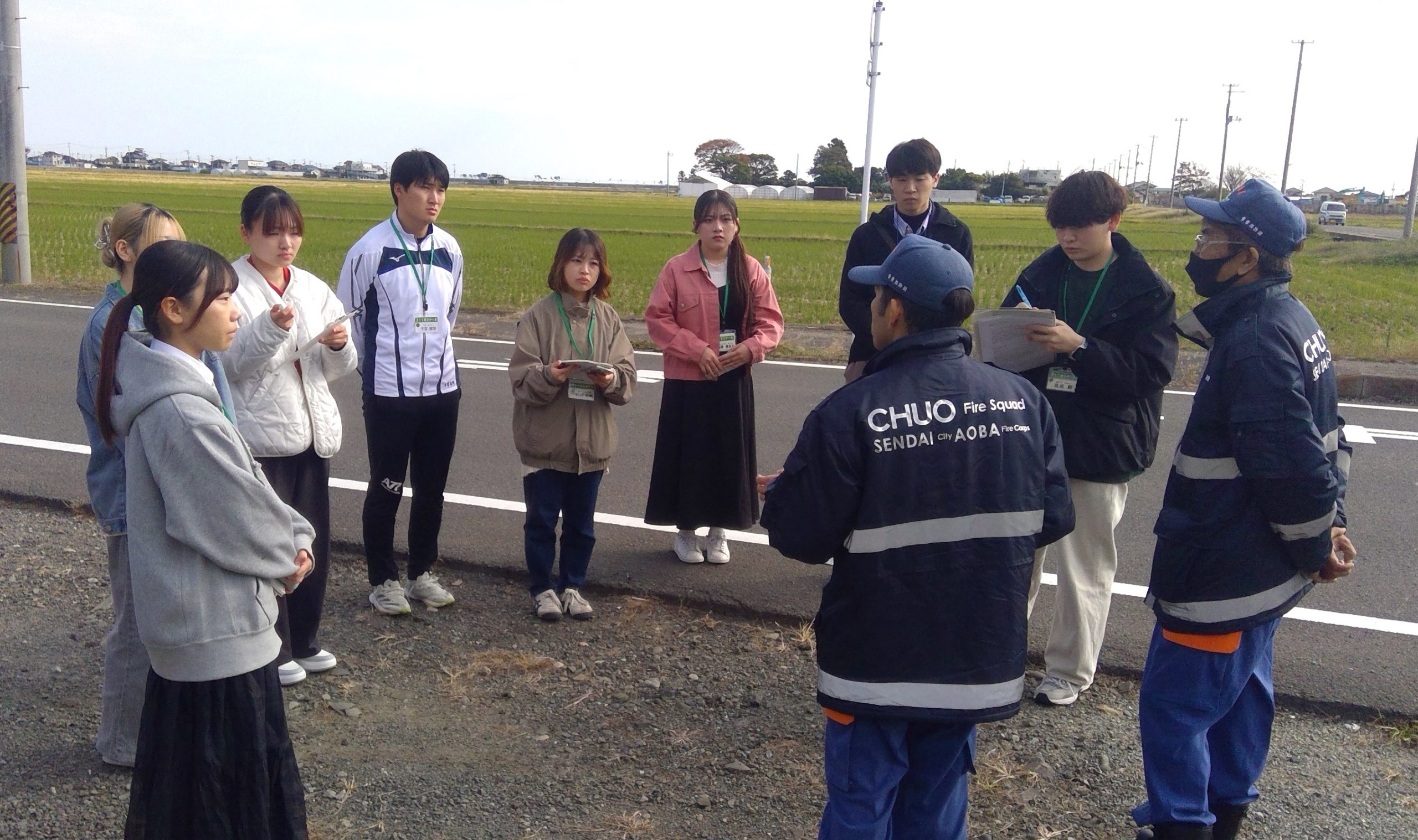 本来、市中心部の担当である中央分団から震災翌日の3月12日に現場に駆け付けたという団員は、全面海とがれきになった惨状に呆然としたこと、生存者を探しつつ犠牲者の発見と収容に全力を尽くしたことなどを語り、大災害の厳しい現実をゼミ生に伝えました。将来教壇に立つゼミ生に対して「大都市仙台の近郊で起きた震災の出来事を教訓とともに伝える役割を担ってほしい」と呼びかけました。ゼミ生たちは消防団の役割を実地に確認し、地域防災の視点を共有しました。