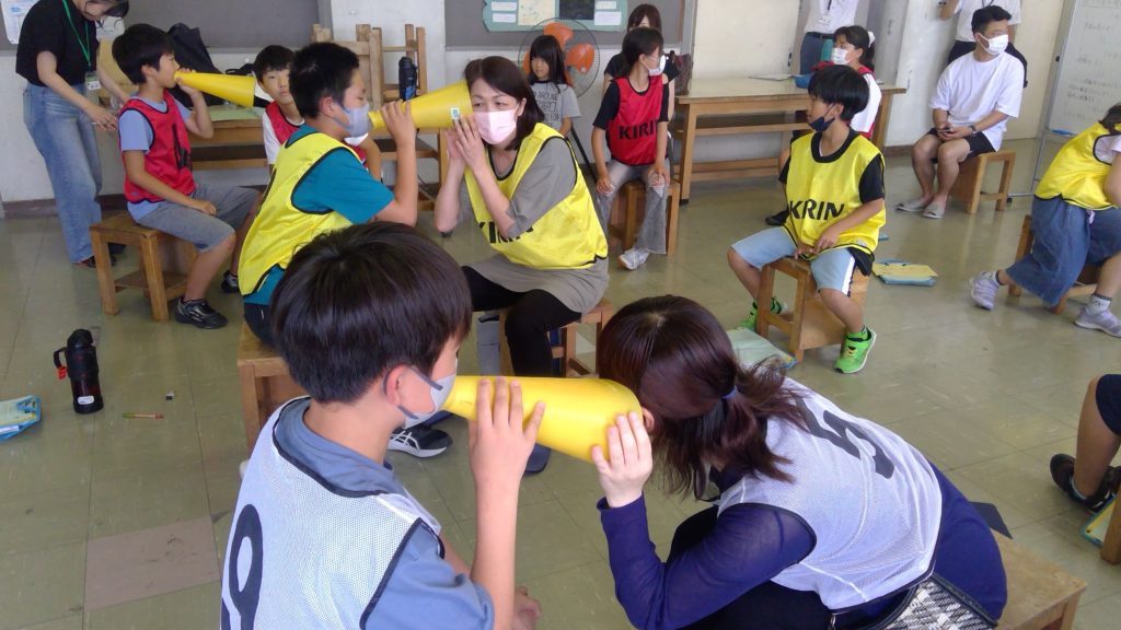 6人は1カ月間、企画を練り、伝言ゲームの形式で災害時の情報を伝え合うゲームを独自に作り上げました。メガホンで情報をリレーすることとし、タイトルは「命のメガホンをつなげ!」。津波の危険と避難先などを伝える情報が正確に届くかどうか、を競い合うものです。児童と保護者が懸命に防災無線の内容を伝えますが、避難先の情報がうまく伝わらず、苦戦する様子も。あえて街やSNSのうわさを流す仕掛けもあり、未確認情報の拡散に注意することを学びました。