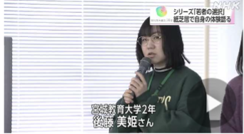 3月6日朝の仙台ローカルのニュースでは、2年の後藤美姫さんが取り上げられました。後藤さんは311ゼミの「次世代伝承」グループの活動で、紙芝居や絵本による震災伝承の有効性を調べました。東松島市野蒜で幼稚園バスに乗車している時に震災に遭い、避難した自らの経験を紙芝居で伝えようと、仲間とともに制作に取り組んでいます。「教員を目指す立場で震災を知らない世代に伝え継ぐ役割を果たしたい」と意気込んでいます。