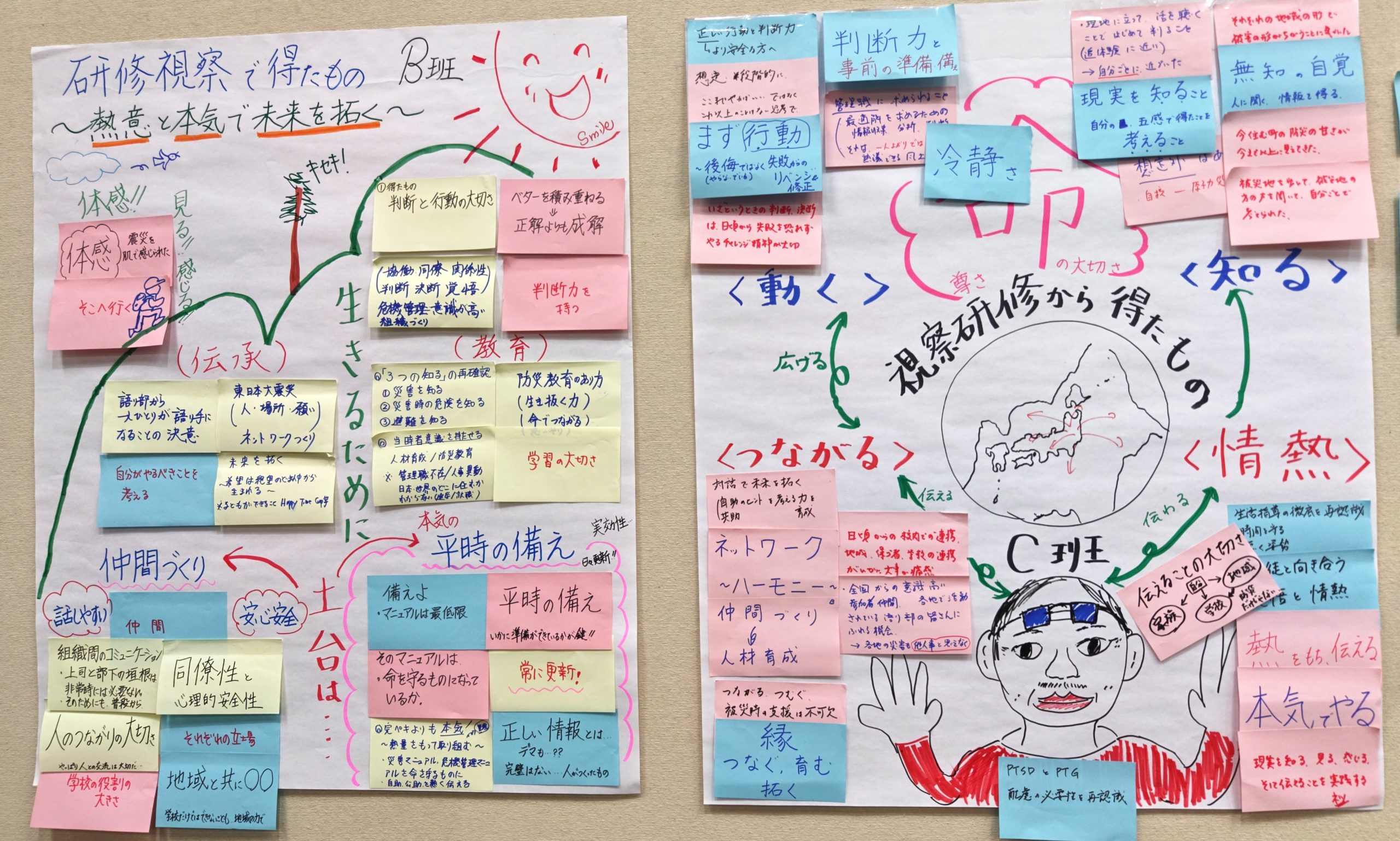 「避難場所についてたくさんの意見共有がされていた。きちんと自分の意見を伝える教員の存在から、事前の準備や人間関係の大切さを改めて感じました。震災当日の、実際に走って上がって行った判断、津波の恐ろしさ、地域の人々との協力、校長先生の後悔など、具体的に現地でお話を聞くことができたことは、本当に貴重な経験でした」