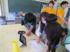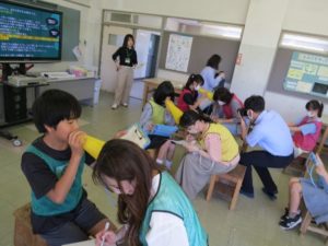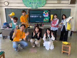 6月13日、石巻市の開北小学校が校内で開いたイベント「防災チャレンジデー」に参加し、311ゼミの有志学生7人が災害情報を伝え合うゲームを実施して、児童や保護者に災害時の情報のやりとりの大切さを呼び掛けました。