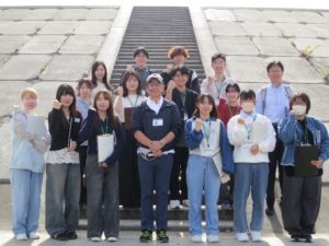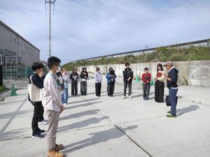 10月18日(土) 311ゼミナール避難所運営班が、震災当時、海岸から約200mの場所に立地していた渡波中学校跡地を訪ねました。講師に当時教頭であった三浦浩氏をお迎えし、発災時や津波のようす、教員の対応、住民の避難のようす、その後の避難所運営、学校再開までの流れ等々について説明を伺いました。渡波中学校は大津波により、校舎は二階床上、体育館は3mまで浸水するなど壊滅的な被害を受けました。そのため、震災後、万石浦中学校、稲井中学校、万石浦小学校を間借りし授業再開、その後稲井小学校校地内に仮設校舎が完成し授業再開、そして2017年に内陸の新校舎へ移転しています。現在渡波中学校跡地周辺は、津波の減勢を図るために高さ4.5mの防潮堤が建設され、その内側に緑地や高盛土道路、パークゴルフ場や多目的広場を配した防災緑地として整備されています。さらに、防災緑地の近くには、津波が発生した際、内陸に逃げ遅れた人のために津波避難タワーが建てられています。鉄骨造りのタワーの高さは約14mで、約200人を収容できるそうです。当時の避難所運営については、地域の方々との協働や妊婦さんの対応、県外からの温かな支援などについて、経験された三浦氏だからこその貴重なお話を伺うことが出来ました。三浦氏は最後にまとめとして「平時から災害に備えておくこと」、そして教員を目指す者として「自分の命は自分で守る力を育成すること」「防災教育などを通して震災を風化させないこと」を話されました。次代を担う学生が、この研修で得たことや考えたことをもとに、安心安全の為のバトンを、未来を生きる子どもたちへ確実に繋いでいってくれることを期待しています。
