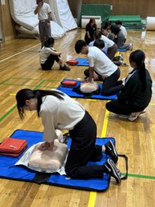防災教育研修機構では、令和7年10月8日 12:30~14:30 表現活動実習棟2階にて普通救命講習を実施しました。仙台市青葉消防署の堤(つつみ)消防指令長を講師としてお招きし、心肺蘇生法を中心に緊急時の応急手当を学びました。4年生7名、3年生3名、職員2名が受講し、グループに分かれて胸骨圧迫やAEDの使用法などを繰り返し練習しました。学校現場を含め、救急隊として実際に数多くの救命救助をされてきた堤指令長の臨場感あふれるお話しにより、受講生が一層真剣に講習に取り組む様子が窺えました。